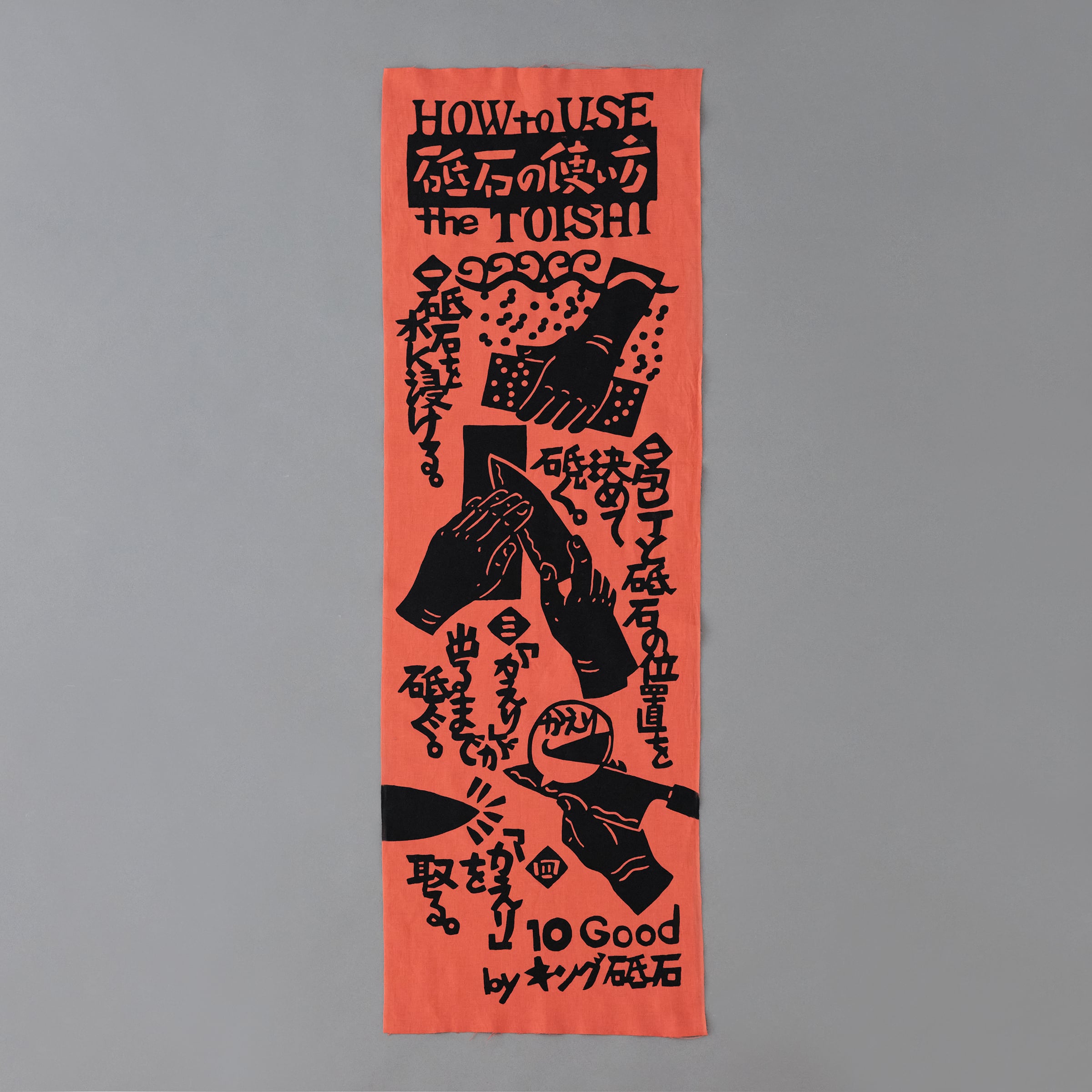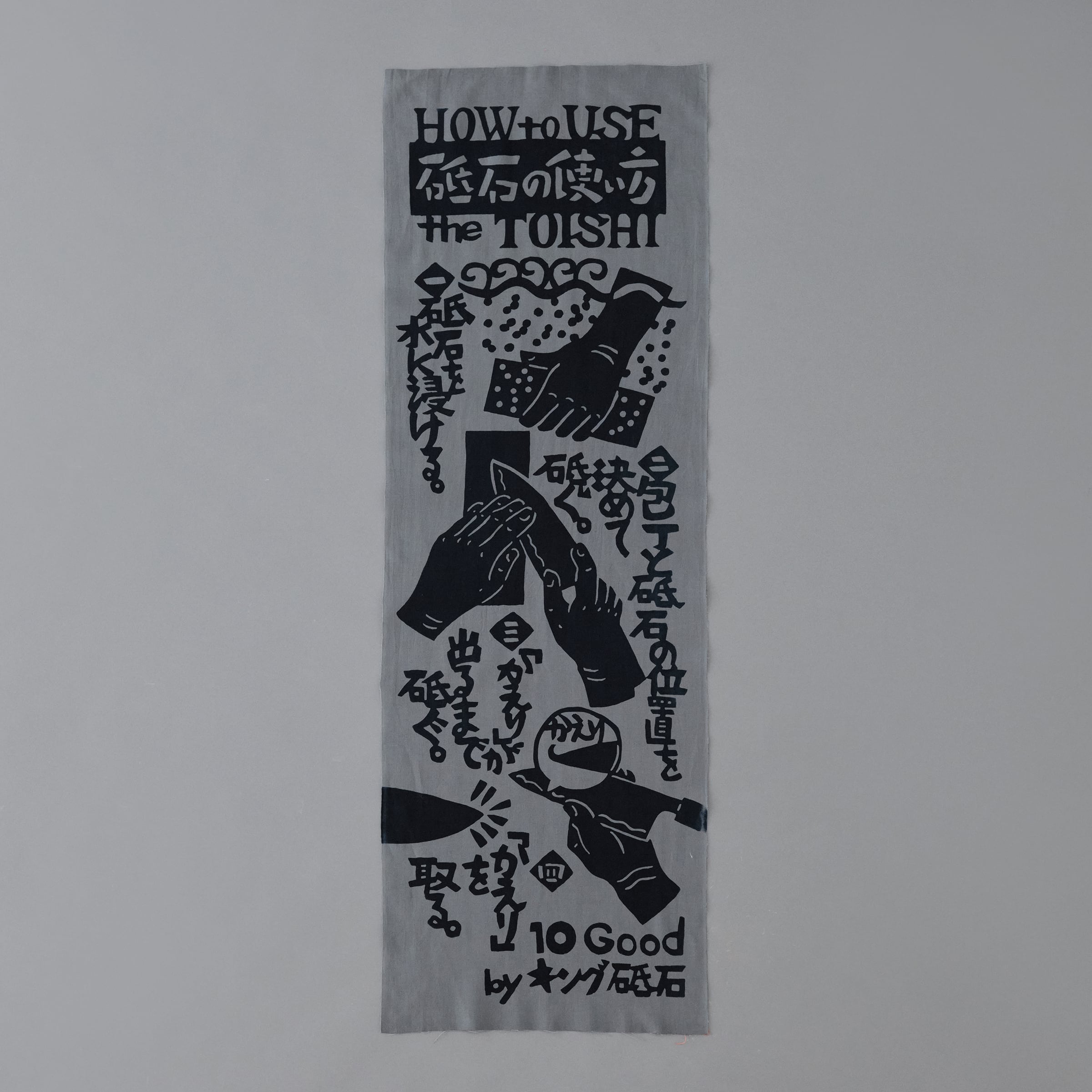 砥石の使い方を描いた手ぬぐい。